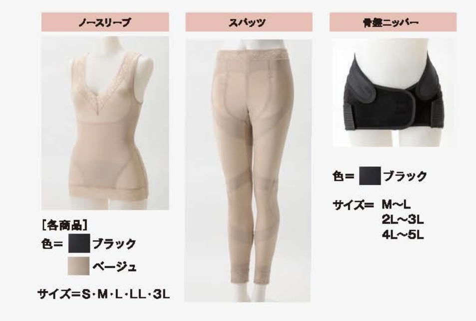ノースリーブ、スパッツ、骨盤ニッパーの3タイプで色は黒とベージュをご用意しました。サイズはS、M、L、2L、3L 幅広く品揃えしております。