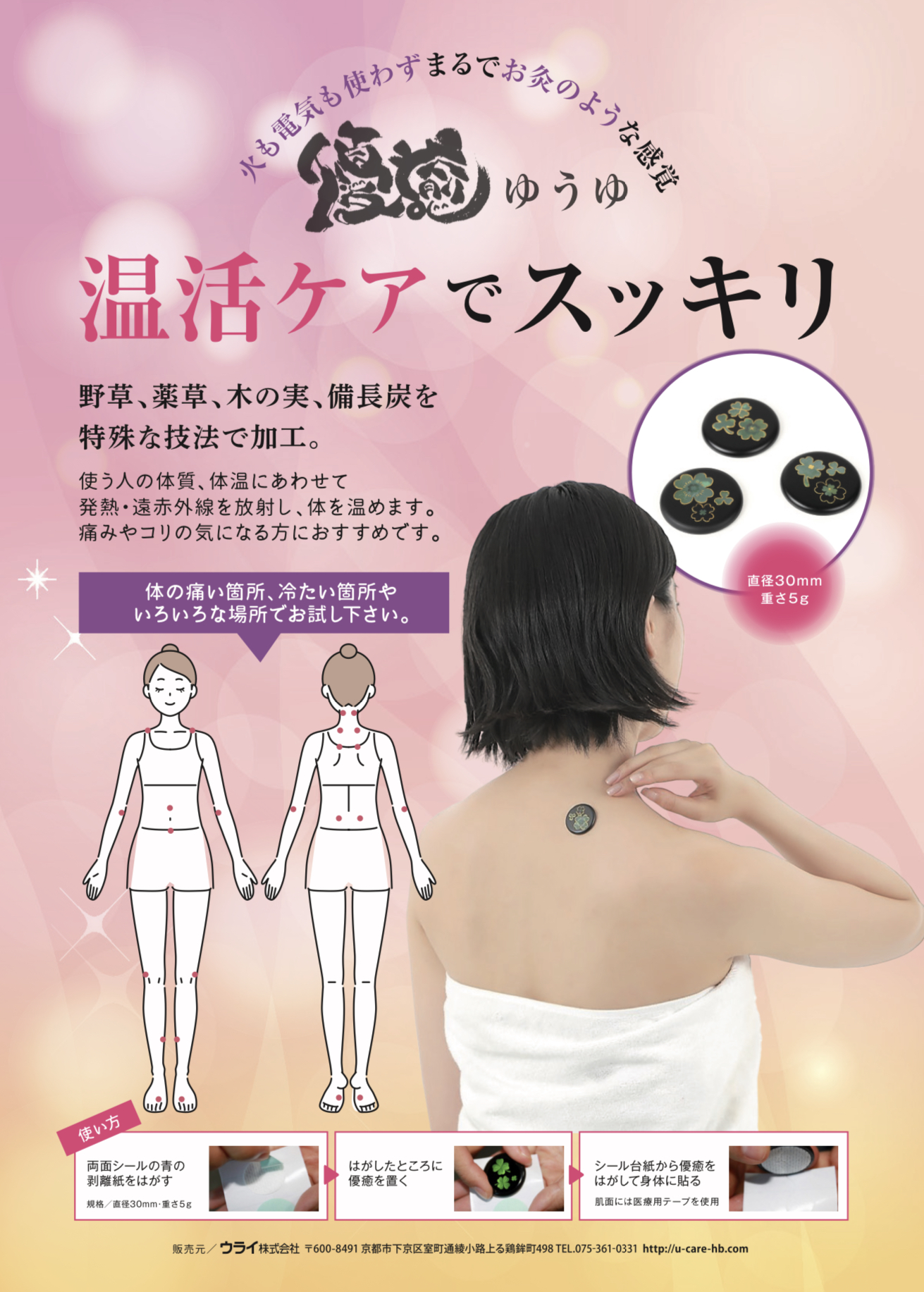 新製品 火を使わないお灸 「優癒」2022/06/21野草・薬草・備長炭を原料とし炭にしたものをお灸玉にした世界唯一の温熱器。使う人の体温・体内の水分などの波長に合わせて遠赤外線を放出します。世の中にある家電製品とは一線を画すエコで画期的な商品です。 -